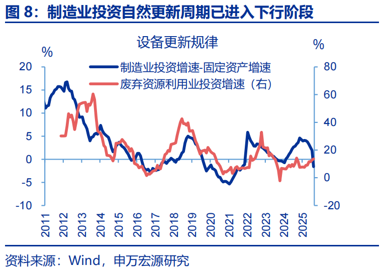 需求:需求压力或更多体现在制造业领域,主要表现为企业加快清缴欠款,对投资产生额外拖累。近两年部分企业以欠款形式增加投资,本轮化债除聚焦地方政府外,也要求企业加快清缴欠款;由于当前企业盈利偏弱,企业或将用于投资的资金清缴欠款,导致固定投资回落。2025年6月来应收账款增速明显回落,与固定资产投资回落的时点基本一致,也与2019年清缴中小企业欠款时类似。9月应收账款增速进一步降至5.7%,短期来看清缴欠款或仍对制造业投资产生拖累。此外,去年来,制造业投资表现强劲并非源于政策驱动,更多是设备处于自然更新的上行周期;但下半年来,自然周期进入退坡阶段;制造业投资较固定资产增速的差值在达阶段性顶点后持续回落。