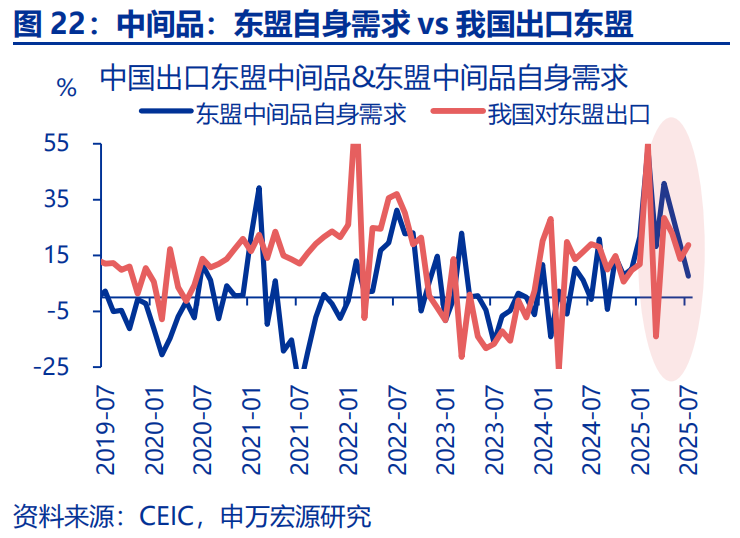 出口:10月中美关税一度再生波折,“抢出口”或再支撑10月出口。10月10日美国威胁自11月起对中国所有商品加征100%关税,预期关税政策加码或再度引发对美“抢出口”。考虑到企业发货到报关出口存在时滞,10月最后一周港口外贸货运量出现冲高现象,同比较前周上行18pct至20%,或反映“抢出口”现象。并且出口链生产只衡量当期生产、本月更多受到高库存约束;而港口外贸货运量还包括存货用于出口。当期生产回落,但存货仍可用于出口,因此10月港口外贸货运量并不弱。加之9月加工贸易进口同比回升(+6.6pct至12%),10月出口同比预计维持韧性(7%)。