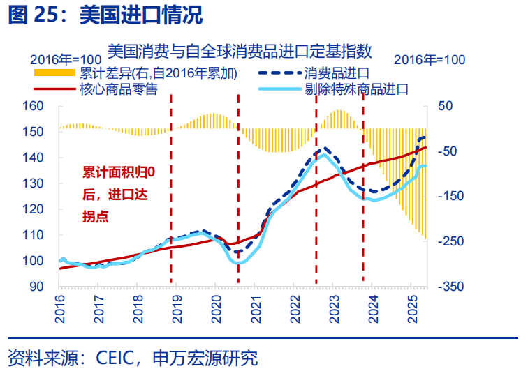10月底中美“关税政策”迎来缓和,加之我国在新兴份额持续提升下,后续出口可能仍延续高景气度。中美关税出现进一步缓和,芬太尼关税降低10%基本对应支撑当月出口同比1个百分点左右(关税1.0时期、今年4月以来出口弹性均在1倍左右),加之欧美发达国家仍处于补库周期,预计后续对发达经济体出口仍有空间。与此同时,新兴国家工业化、城镇化提速带来增量的生产资料进口需求,以及我国在新兴市场份额持续提升等逻辑,我国中间品、资本品出口持续走强,预计后续出口仍保持高景气。
