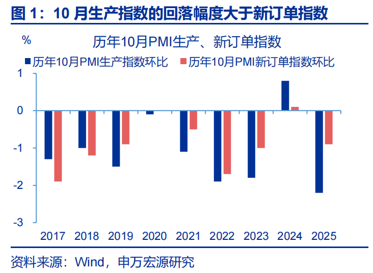 供给:10月工作日天数减少叠加库存走高,可能共同对生产形成约束。10月制造业PMI较前月-0.8pct至49%,结构上生产指数降幅大于新订单。一方面,10月工作日天数仅18天、同比较前月减少3天,对供给拖累较大。另一方面,前期制造业存在“补库存抢生产”现象,高库存对10月供给也有较大约束;高炉、PTA开工等指标也指向供给本月或有走弱,出口链生产也呈更弱表现。