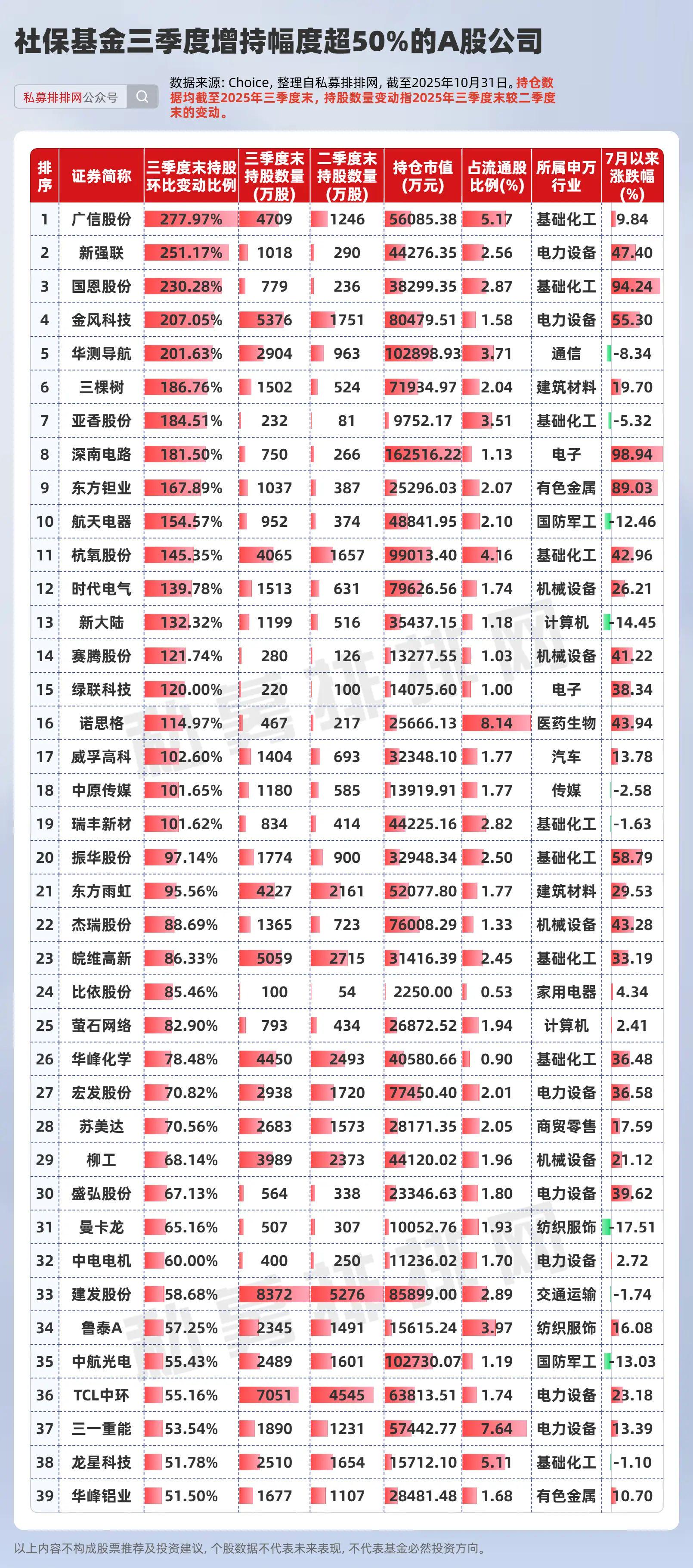 从持仓的市场表现来看,2025年三季度末社保基金重仓的622家上市公司,7月以来股价平均涨幅为19.24%,其中,487只个股7月以来实现正涨幅,股价涨幅超50%的有63只,股价涨幅超60%的有41只。