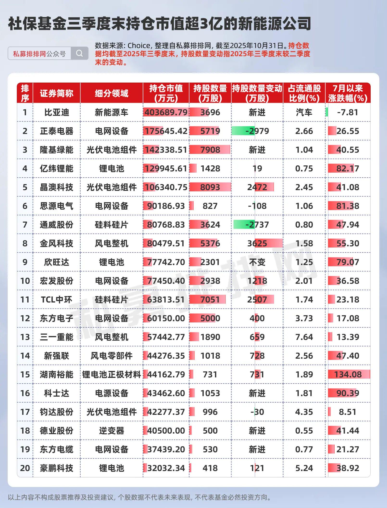 经笔者梳理,三季度末社保基金持仓市值超3亿元的新能源企业有20家,7月以来平均涨幅达45.92%,社保基金重仓的亿纬锂能、思源电气、湖南裕能、科士达等7月以来涨幅均超80%。