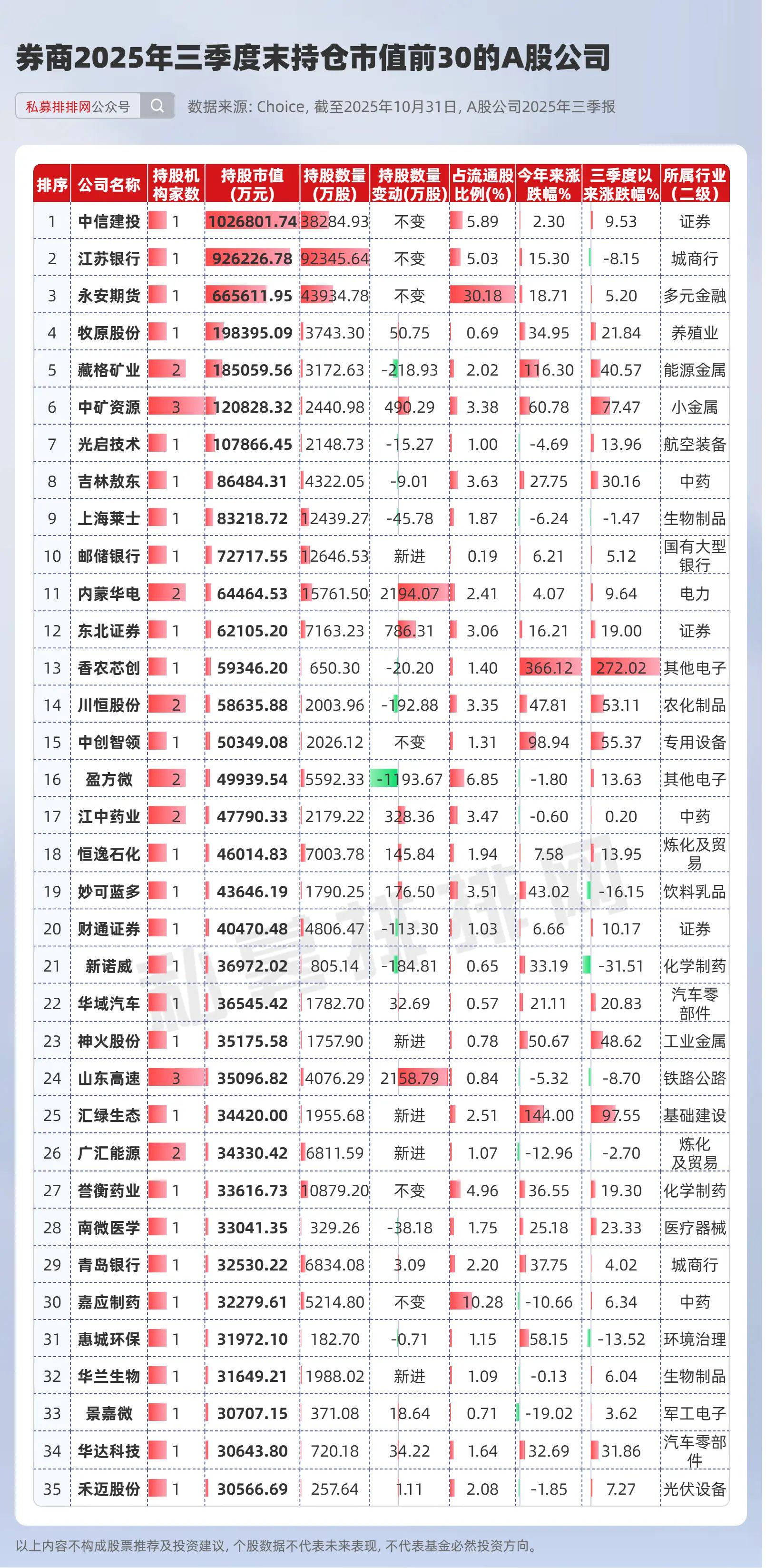 进入11月,A股三季度报已经披露完毕,券商重仓股也已经全部出炉。Choice数据显示,截至2025年三季度末,共有44家券商出现在320家A股公司的前十大重仓股中,持股市值合计664.51亿元,相比一季度末上升17.39亿元。