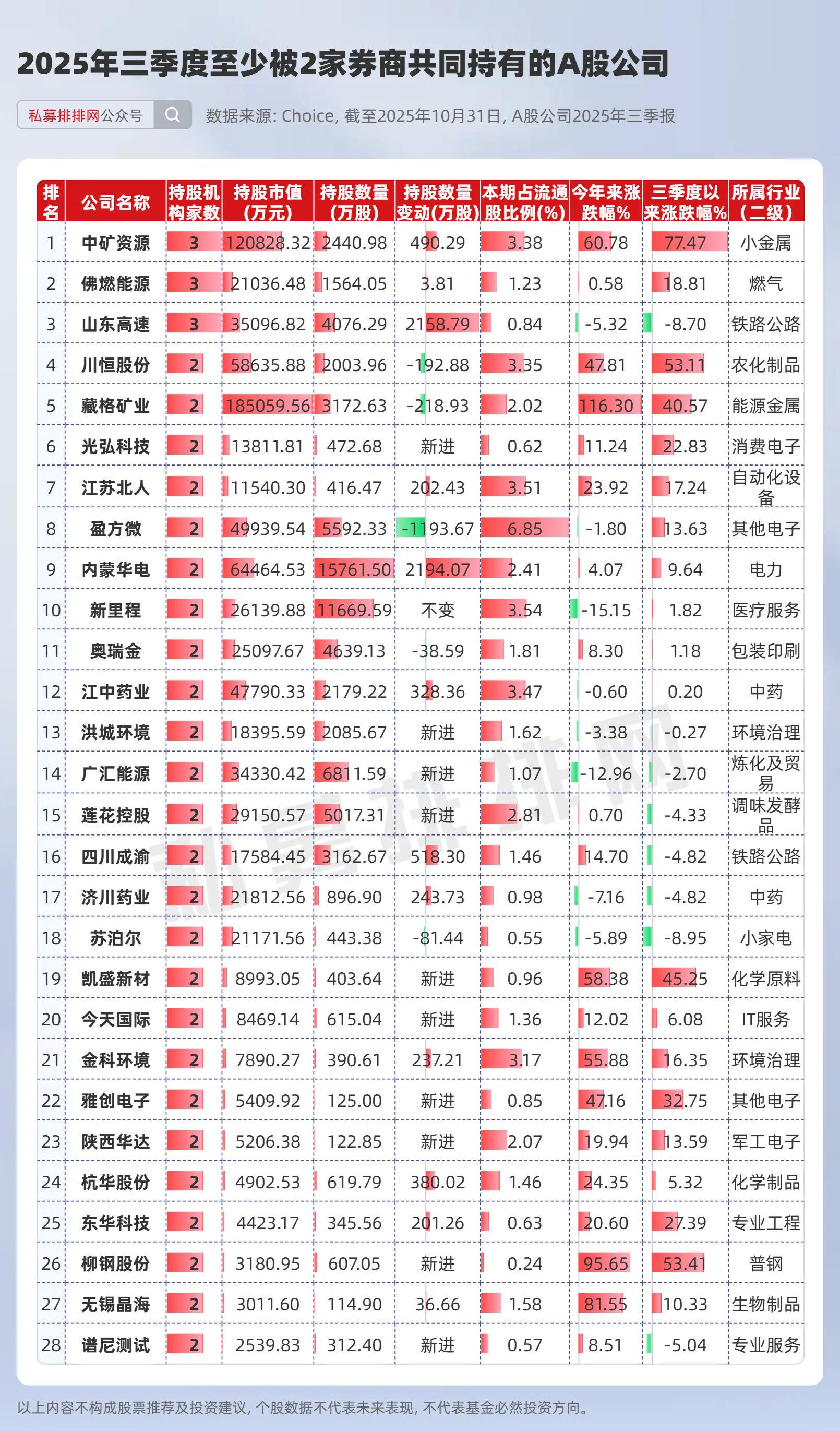 从持股机构家数来看,至少被2家券商共同持有的公司共有28家,其中中矿资源、佛燃能源、山东高速被至少3家券商共同持有。