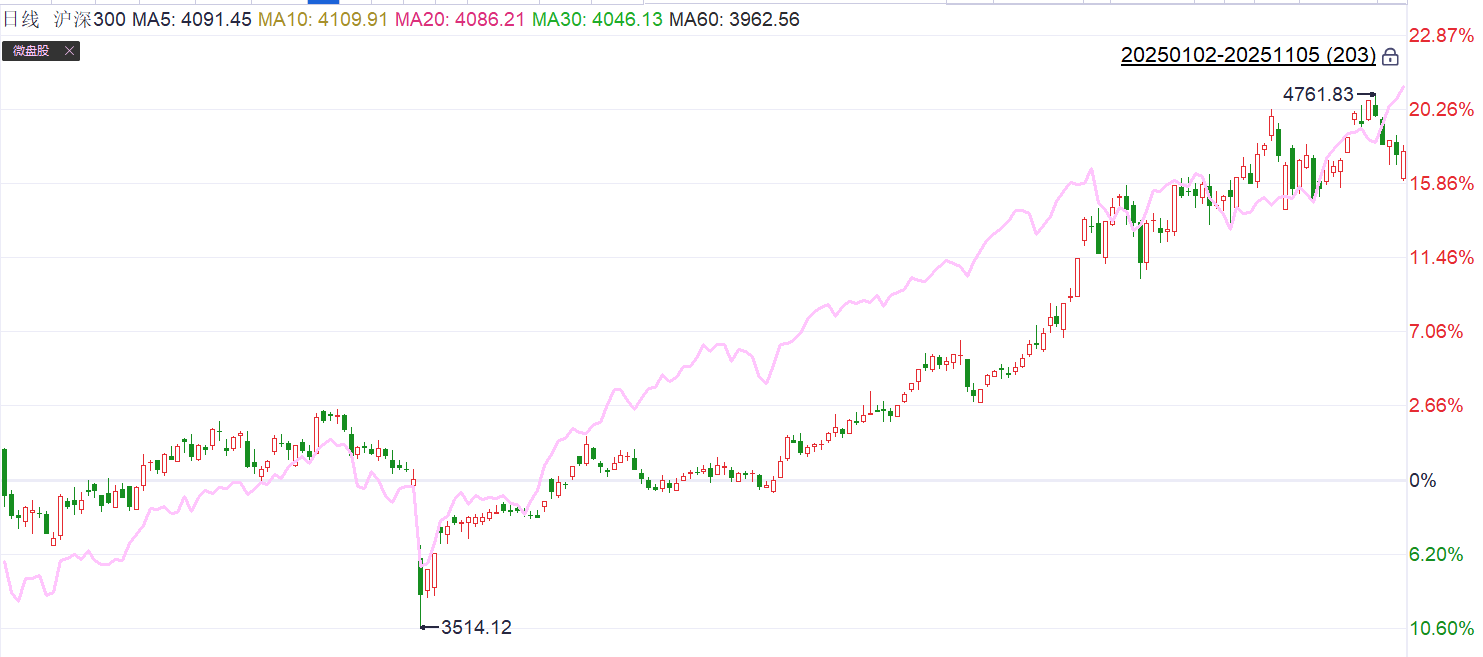 (蜡烛图:沪深300指数;折线图:微盘股指数)