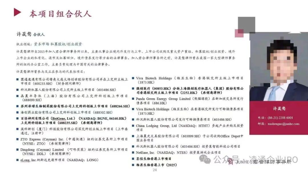 不过,由于君合律所已经删除许晟骜的信息,在百济神州、海创药业、晶晨半导体等的《招股书》中也并未出现许晟骜的名字。这意味着其并不是以上项目的主要律师。
