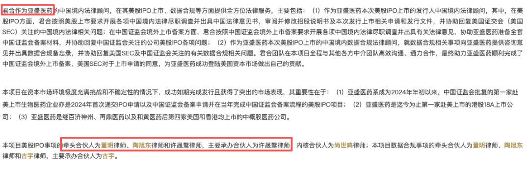 2025年1月24日,许晟骜进一步参与了亚盛医药(AAPG.NASDAQ,06855.HK)在纳斯达克的上市,为牵头合伙人、主要承办合伙人。