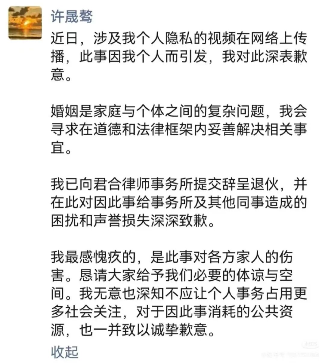 几乎同时,一则署名“许晟骜”的朋友圈截图开始在业内流传。该声明称,近日,涉及我个人隐私的视频在网络上传播,此事因我个人而引发,我对此深表歉意。
