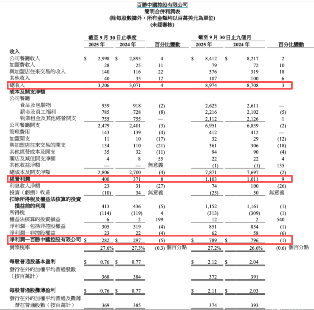 11月4日晚间,肯德基和必胜客中国内地连锁店运营商百胜中国(9987.HK,NYSE:YUMC)发布2025年第三季度报告。第三季度百胜中国总收入同比增长4%至32.06亿美元;经营利润录得4亿美元,同比增长8%;归母净利润为2.82亿美元,同比下滑5%。前三季度百胜中国总收入同比增长3%至89.74亿美元;经营利润录得11.03亿美元,同比增长9%;归母净利润为7.89亿美元,同比下滑1%。