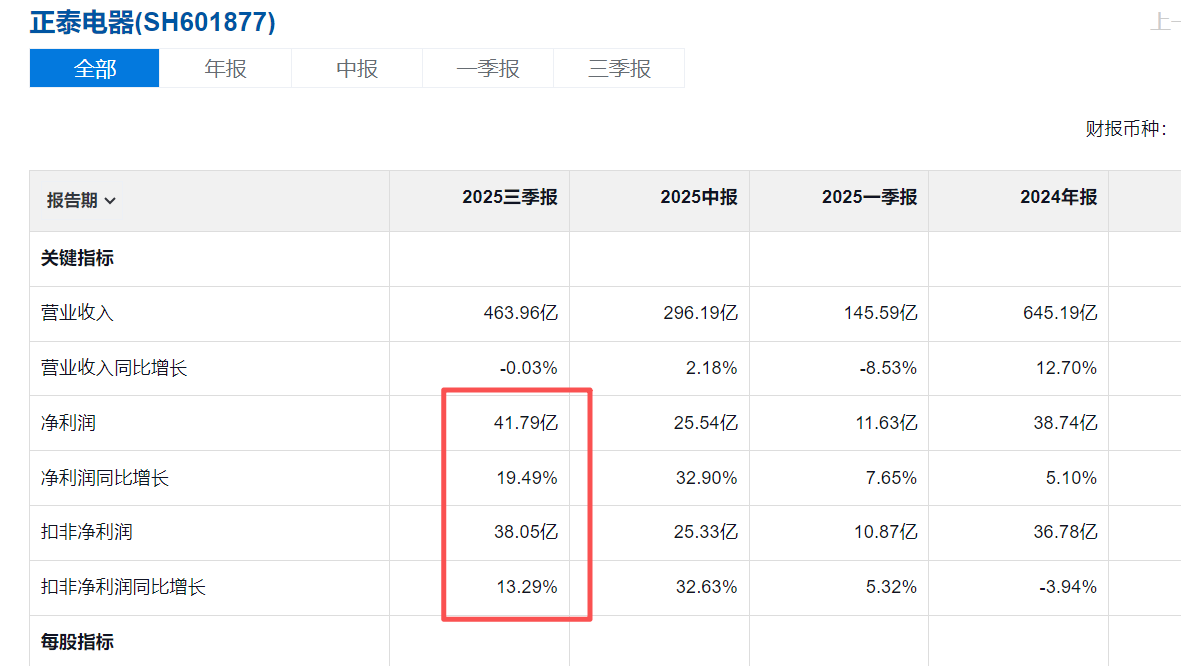 10月29日,浙江正泰电器股份有限公司(下称,正泰电器)披露的2025年前三季度财报,如同一份低调却厚重的成绩单,在喧嚣的资本市场悄然掀起涟漪:实现营收463.96亿元,较上年同期微降0.03%,近乎持平;而净利润达到41.79亿元,同比增幅高达19.49%,扣非归母净利润亦实现13.29%的同比增长。