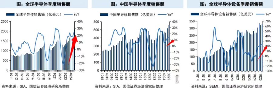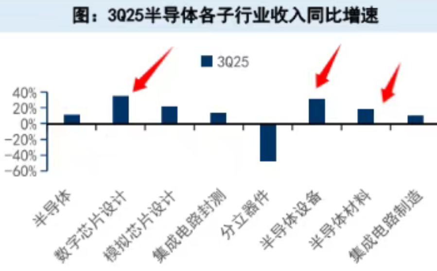 具体来看,据国信证券,2025年三季度半导体收入同比增长11.0%,环比增长3.4%。其中数字芯片设计(+35.0%)、半导体设备(+32.4%)、模拟芯片设计(+22.0%)、半导体材料(+18.61%)同比增速较高,半导体设备(+28.4%)、数字芯片设计(+7.1%)环比增速亦较高。