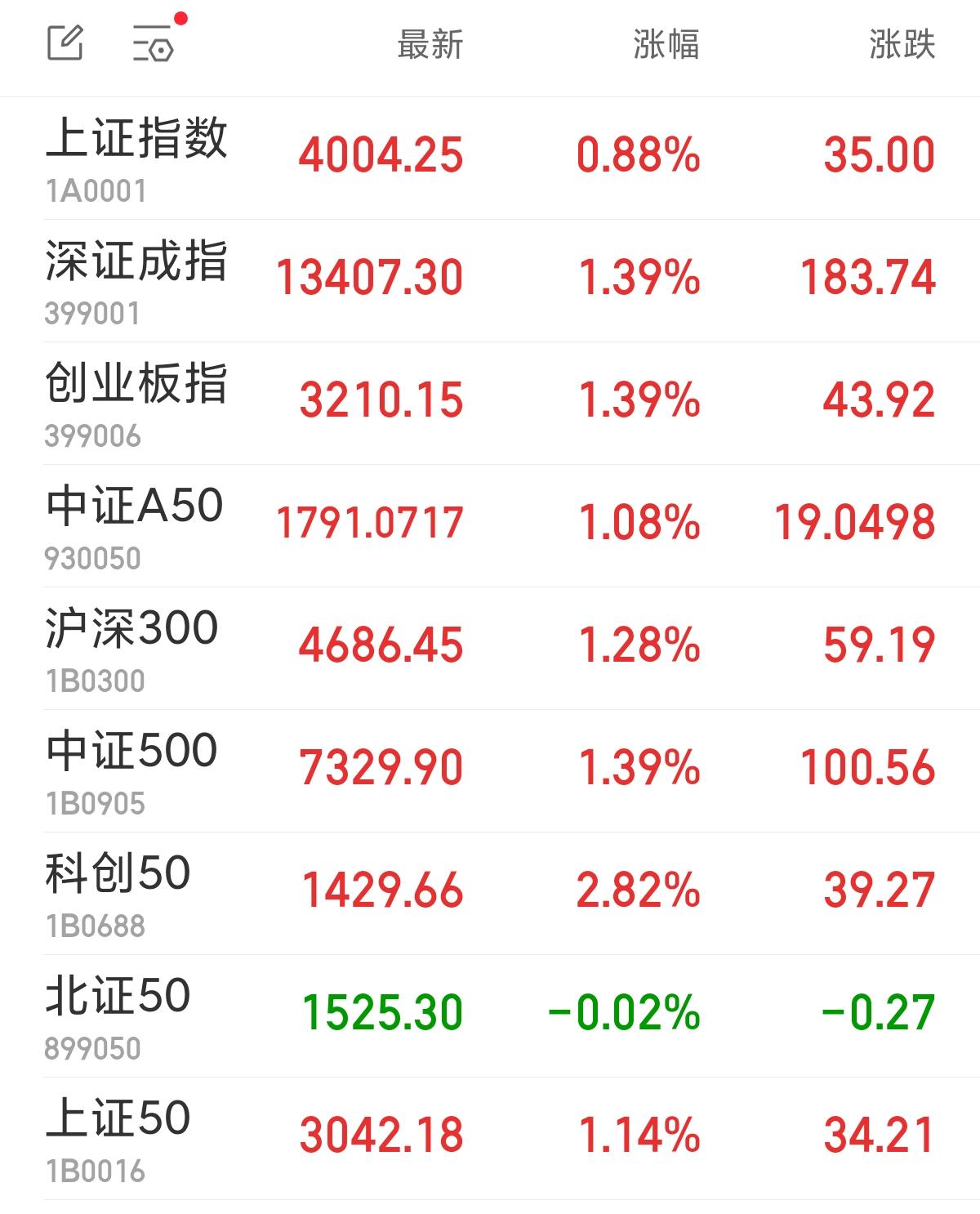 中新经纬11月6日电 周四早盘,A股三大指数高开高走。截至午间收盘,上证指数涨0.88%,报4004.25点;深证成指涨1.39%,报13407.30点;创业板指涨1.39%,报3210.15点。