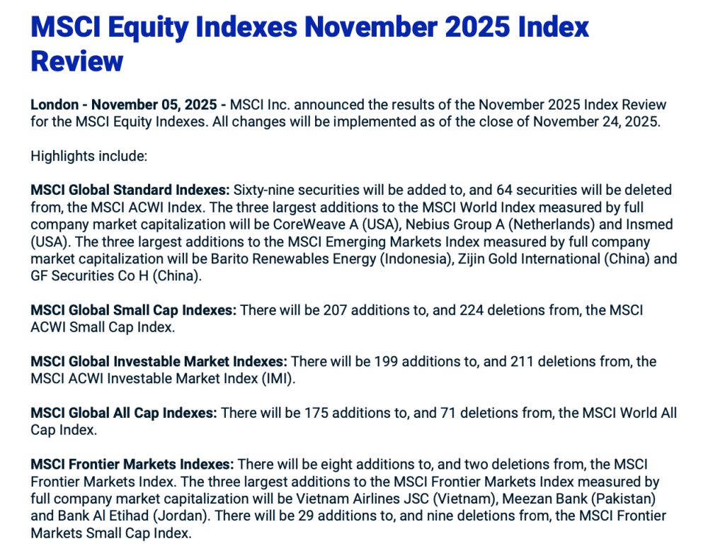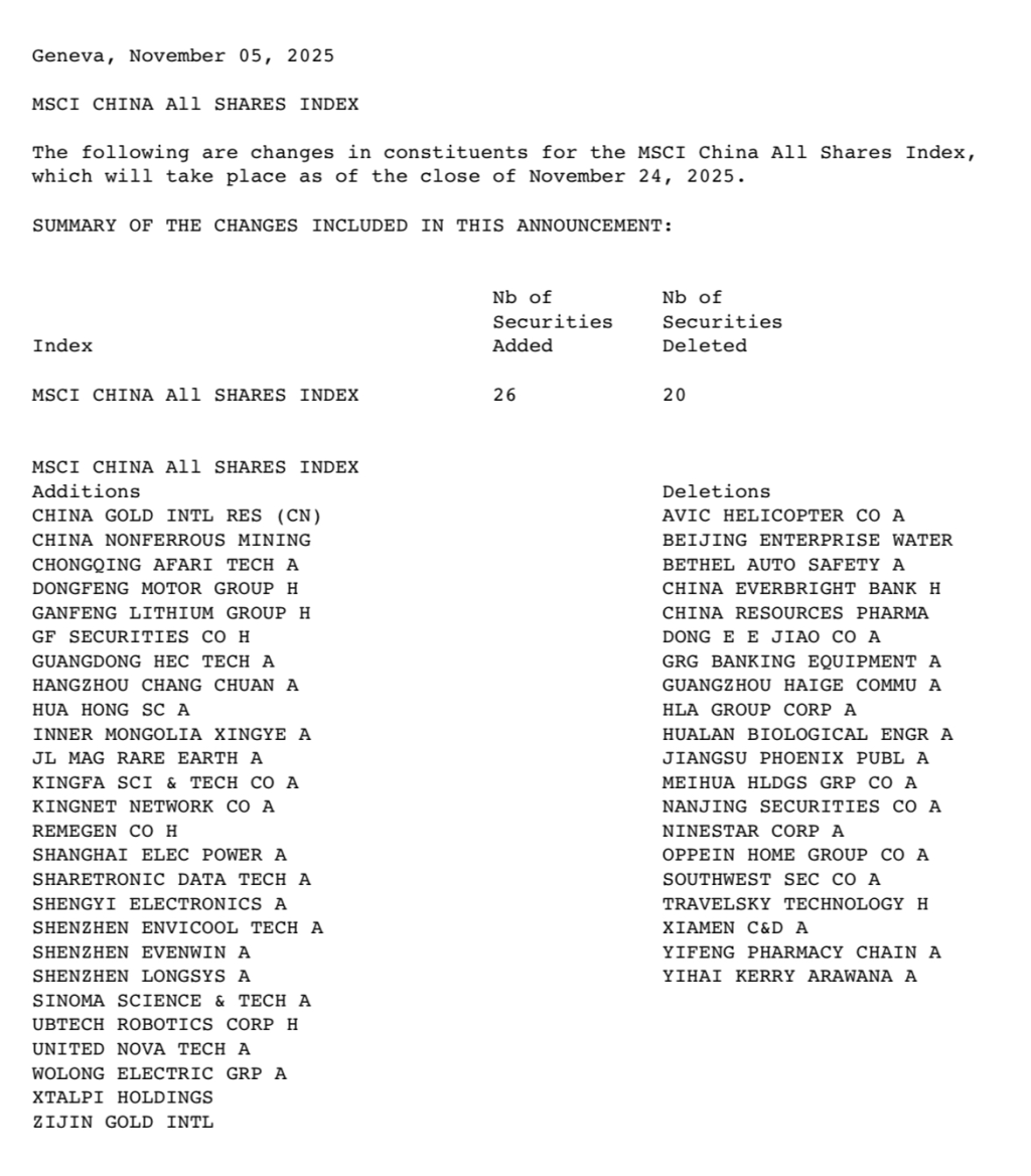 北京时间11月6日,国际指数编制公司MSCI正式公布11月指数审核变更结果。根据公告,MSCI中国A股指数在本次调整中将新纳入17只标的,同时剔除16只标的。本次调整结果将于2025年11月24日收盘后正式生效。