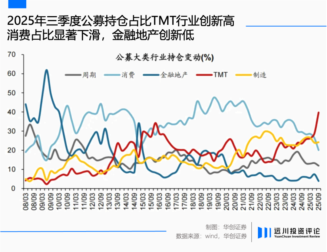 鹏华基金的陈金伟在三季报里的表态具有一定程度的代表性。一方面因没有持有科技股,他的产品在这个阶段大幅落后,另一方面,超配科技的同行整体跑赢指数提升了主动权益的社会形象,也让陈金伟乐见科技股的上涨。但回到投资组合上,他还是坚持以“内需”为投资主线,将组合头寸集中在了可选消费,尤其是服务性消费领域。