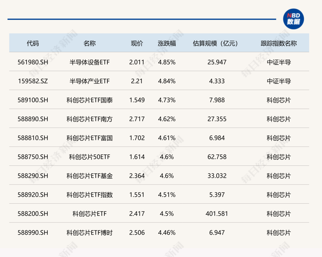 ETF涨跌幅方面,半导体、芯片相关ETF涨超4%。