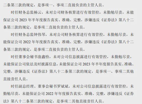 《告知书》称,东尼电子时任董事长沈新芳、时任总经理沈晓宇、时任财务总监杨云和钟伟琴、时任董秘翁鑫怡和时任副总经理、董秘罗斌斌均是事项一和/或事项二的直接责任人员。