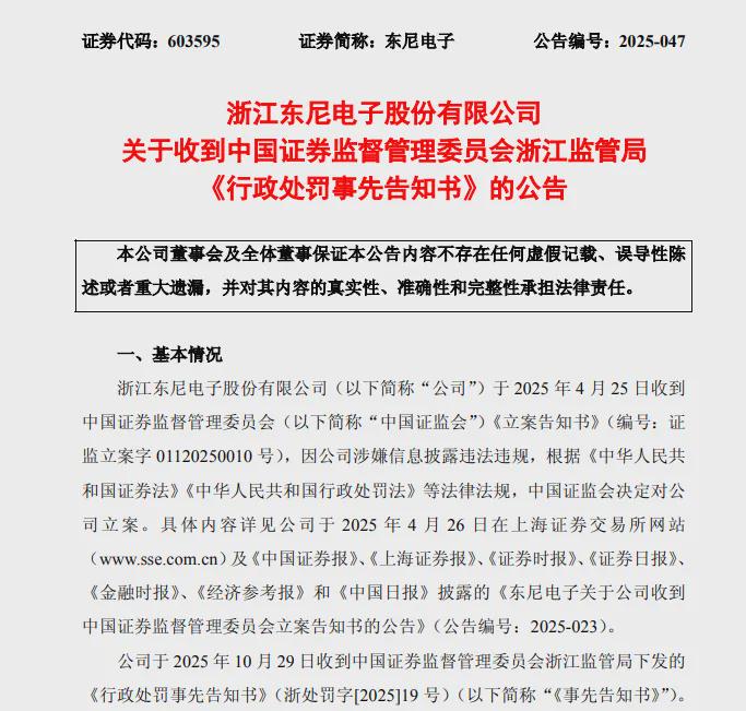 10月30日,东尼电子(ST东尼,603595.SH)公告称,公司于2025年10月29日收到中国证券监督管理委员会浙江证监局下发的《行政处罚事先告知书》(以下简称“《告知书》”)。