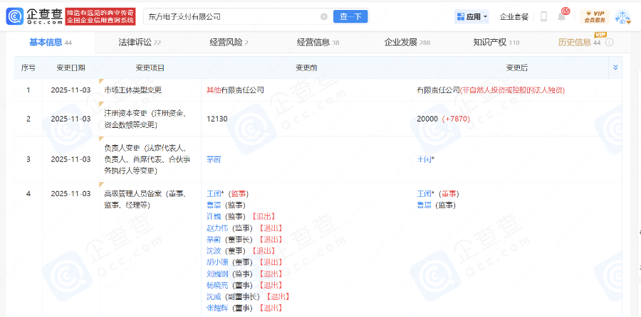 企查查信息显示,11月3日,东方电子支付有限公司(下称“东方支付”)发生一系列工商信息变更,原有股东全部退出,法定代表人变更,同时发生增资。