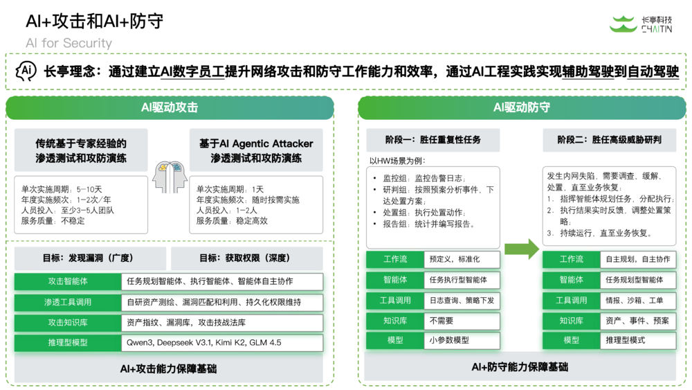 长亭科技提出了通过AI驱动的攻防对抗新思路。尹振玺强调,AI可以在攻击侧帮助模拟高烈度攻击,帮助企业提前发现系统的弱点,而在防守侧,AI可以通过智能化分析和应急响应,提升安全防范能力。例如,AI可以帮助安全运营中心进行实时分析、指挥和溯源,大大提高应对效率。