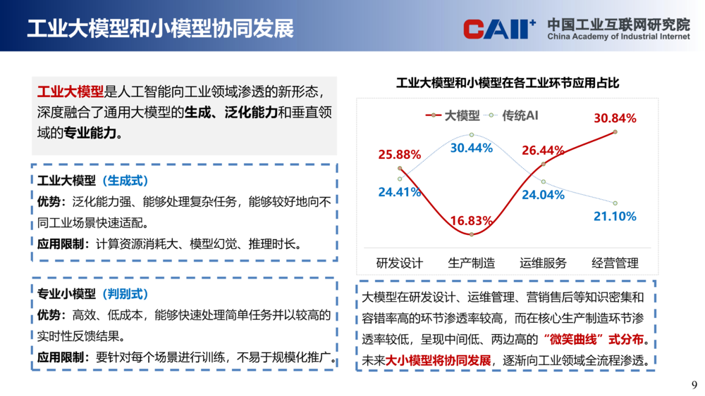 王骁指出,根据对200多家制造企业的调研分析,目前大部分工业大模型的应用集中在研发、设计、运维等外围环节,而核心生产环节仍以传统的小模型为主,形成了“微笑曲线”效应。他强调,工业大模型与小模型的协同应用,将能更高效地推动工厂车间的智能化。