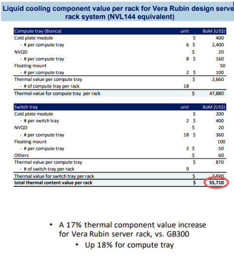 报告还显示,下一代Vera Rubin NVL144平台的散热总价将更高,随着计算托架和交换机托架的冷却需求进一步增加,预计每个机柜的冷却组件总价值将增长17%,达到约55710美元(约合人民币近40万元),其中为交换机托架设计的冷却模块预计价值将显著增长67%。