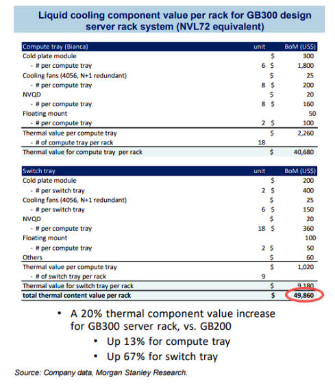 据科技媒体报道,摩根士丹利最新发布的报告显示,英伟达GB300 NVL72机架级AI系统,单单是液冷散热组件的价值就高达49860美元(约合人民币近36万元),这已经比GB200 NVL72系统高了大约20%。