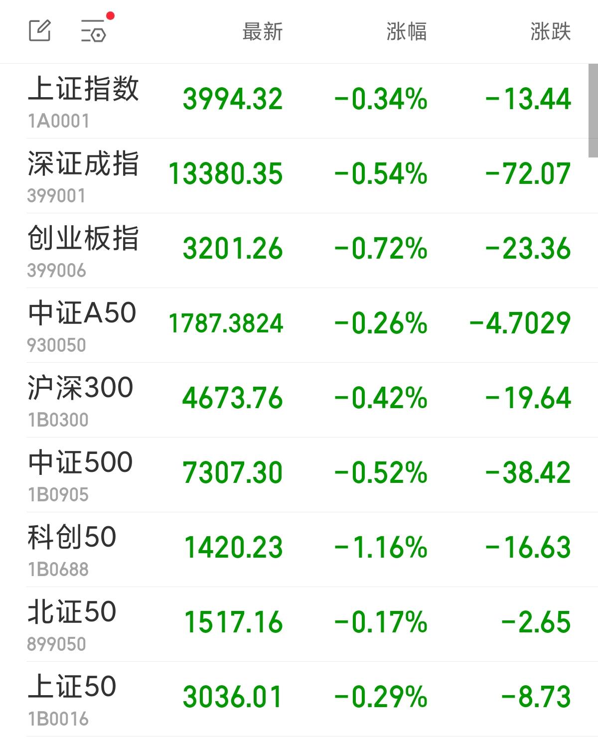 中新经纬11月7日电 周五,A股三大指数集体低开。上证指数跌0.34%,报3994.32点;深证成指跌0.54%,报13380.35点;创业板指跌0.72%,报3201.26点。