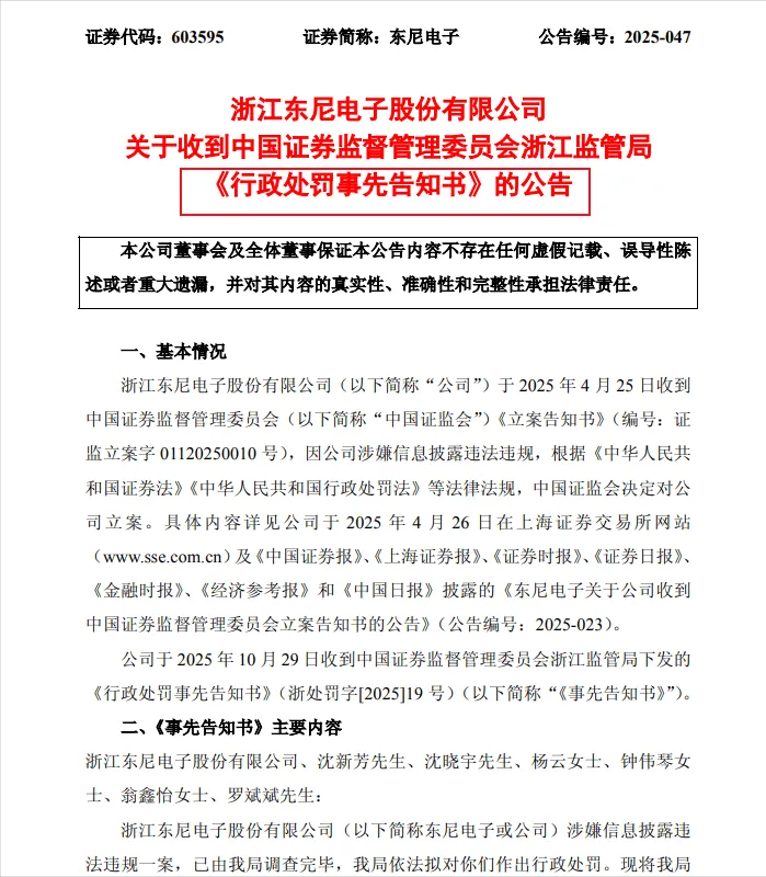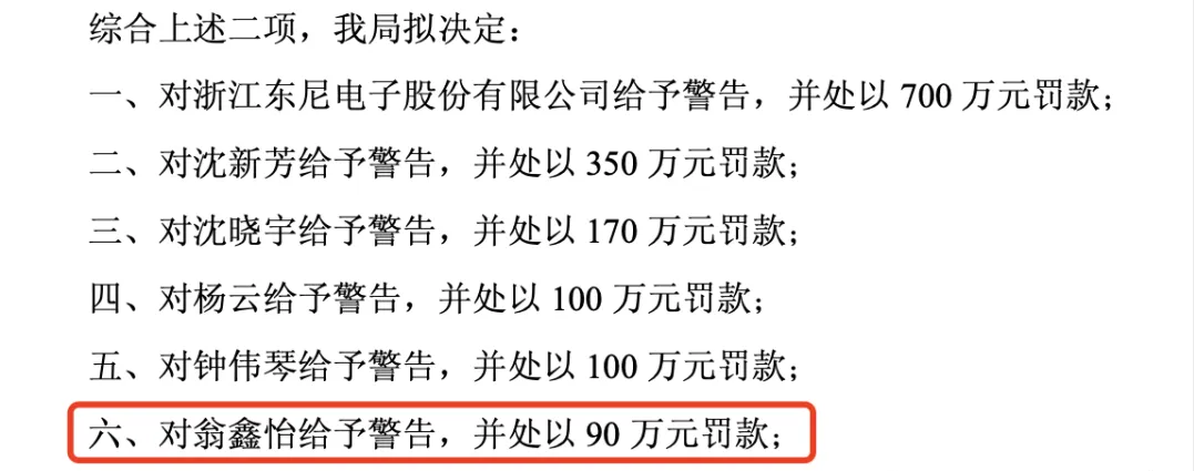 不过,这一次却不是什么光彩的事。近日,浙江东尼电子股份有限公司(下称:东尼电子)披露的《行政处罚事先告知书》显示,作为上市公司信息披露的直接责任人,由于任职期间的东尼电子涉及两项严重违规,年仅30岁的“95后”董秘翁鑫怡,被浙江证监局给予警告并罚款90万元。