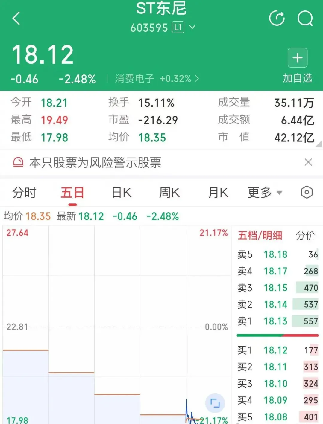 目前,翁鑫怡仍担任东尼电子董秘一职,东尼电子已被实施风险警示,股票简称变更为“ST东尼”后,股价连续4个交易日跌停,11月5日报收18.58元/股,市值缩水至40亿元附近。