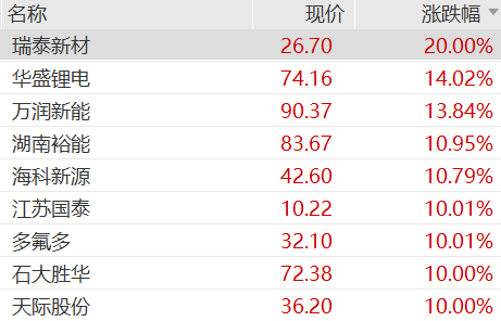 锂电板块快速拉升,瑞泰新材20cm涨停,华盛锂电涨约14%,江苏国泰、多氟多、石大胜华等多股涨停,恩捷股份、新宙邦跟涨。