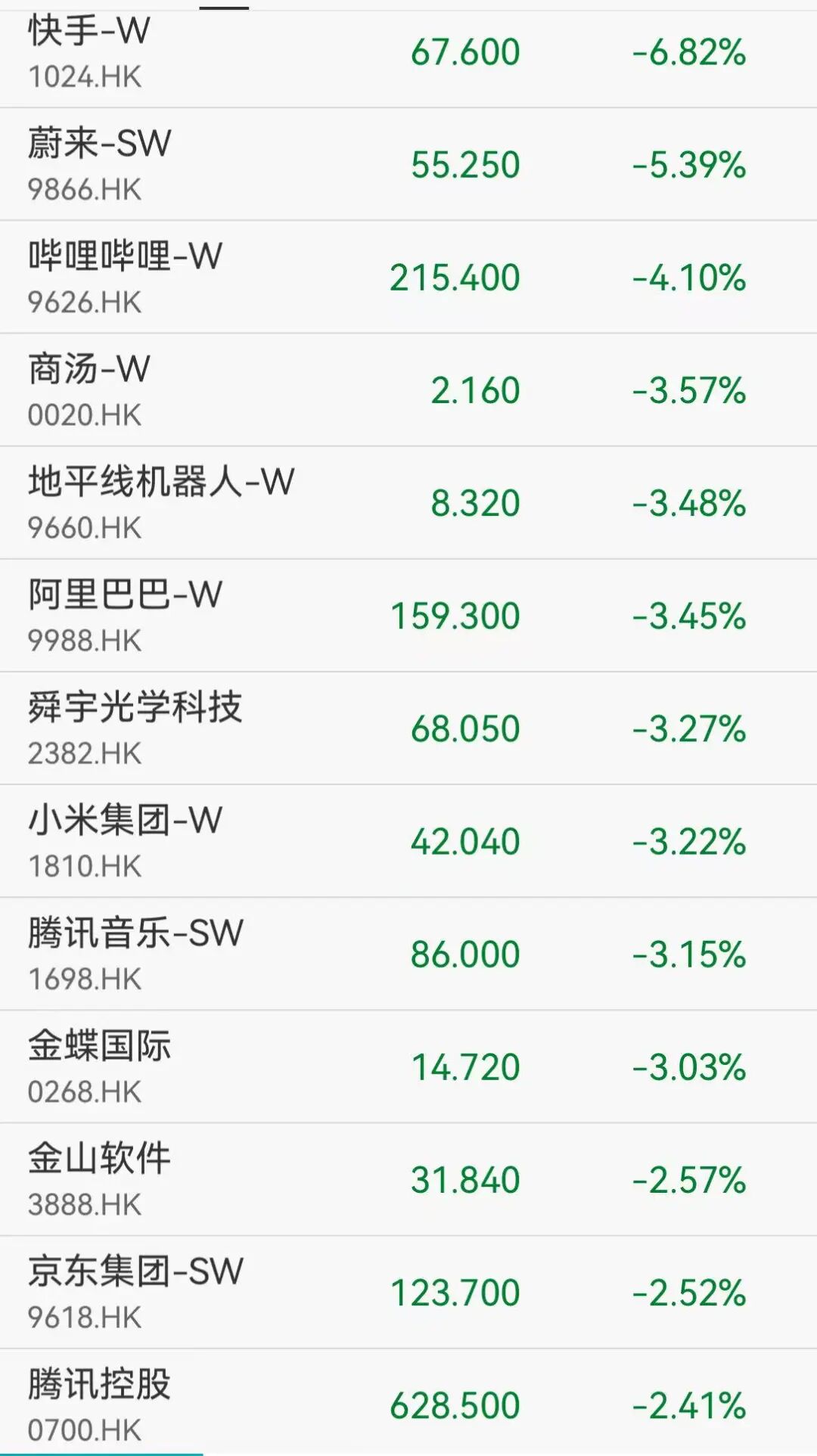 权重科技股集体弱势,快手-W跌近7%,蔚来-SW跌超5%,小米集团-W、阿里巴巴-W跌超3%,美团-W、京东集团-SW、腾讯控股跌超2%。