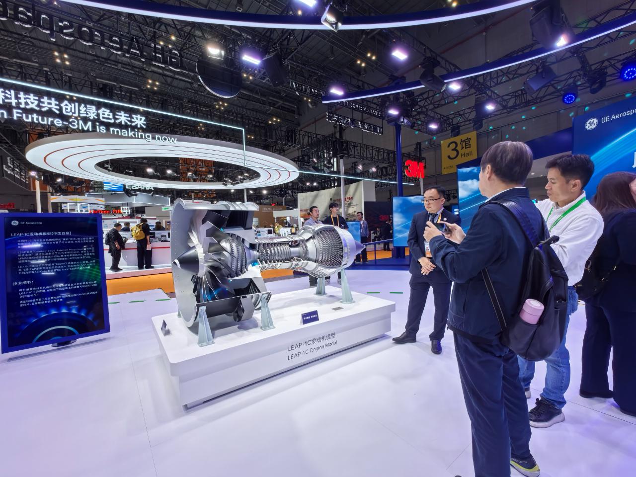 在技术装备展区,GE航空航天带来了中国首展的1:2比例LEAP-1C发动机模型。LEAP-1C发动机为中国商飞C919飞机提供动力装置,而所谓的LEAP,即“Leading Edge Aviation Propulsion前沿航空推进系统”,与上一代CFM56发动机相比,其碳排放减少15%,燃油效率提高15%,噪声影响范围降低75%,同时氮氧化物排放量比CAEP/6标准低50%,为航空交通绿色升级提供技术支撑。