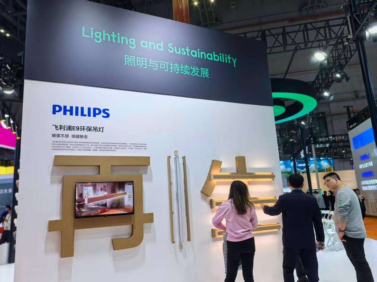 昕诺飞展示的“飞利浦E9环保吊灯”由环保材料制成。