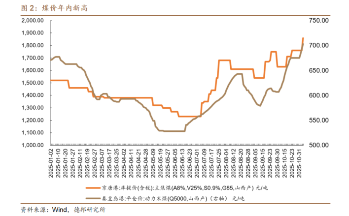 黑色系延续强势表现,焦煤领涨。临近年末,我们认为国内核心产区安全检查或持续偏紧,供给端因素或推动煤炭价格延续上行。本周据Mysteel统计523家炼焦煤矿山样本核定产能利用率为83.8%,环比减1.0%;原煤日均产量186.3万吨,环比减4万吨;原煤库存419.2万吨,环比减12.4万吨;精煤日均产量73.8万吨,环比减2万吨;精煤库存165.6万吨,环比增1.1万吨。截至11月5日,京唐港主焦煤、秦皇岛5000大卡动力煤现货价格分别1860、703元/吨,均创年内新高,现货与期货联动下或推动焦煤为代表的的期货价格延续偏强走势,后续建议关注山西、内蒙古安监检查情况及蒙古国口岸通关量变化。