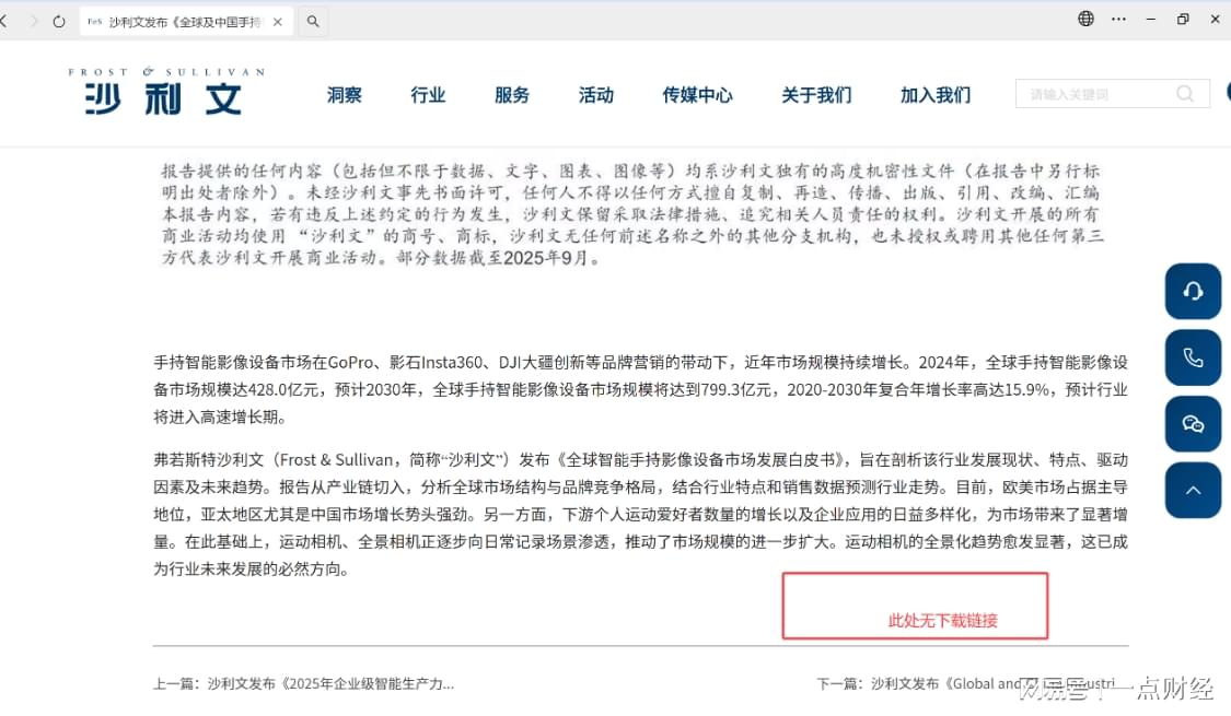 然而沙利文的报告却呈现出完全相反的景象,影石仍以75%的全球市占率稳居第一,大疆仅获得17.1%的份额。更令人疑虑的是,这份报告发布后经历两次“下架”,至今无法在沙利文官方渠道获取,所谓“内部数据核查”的解释,让其可信度大打折扣。