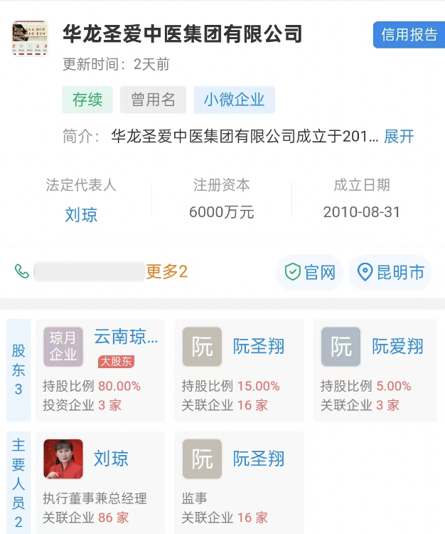 爱企查App显示,圣爱中医集团由刘琼旗下云南琼月控股,阮圣翔、阮爱翔分别持有圣爱中医集团15%、5%的股权。