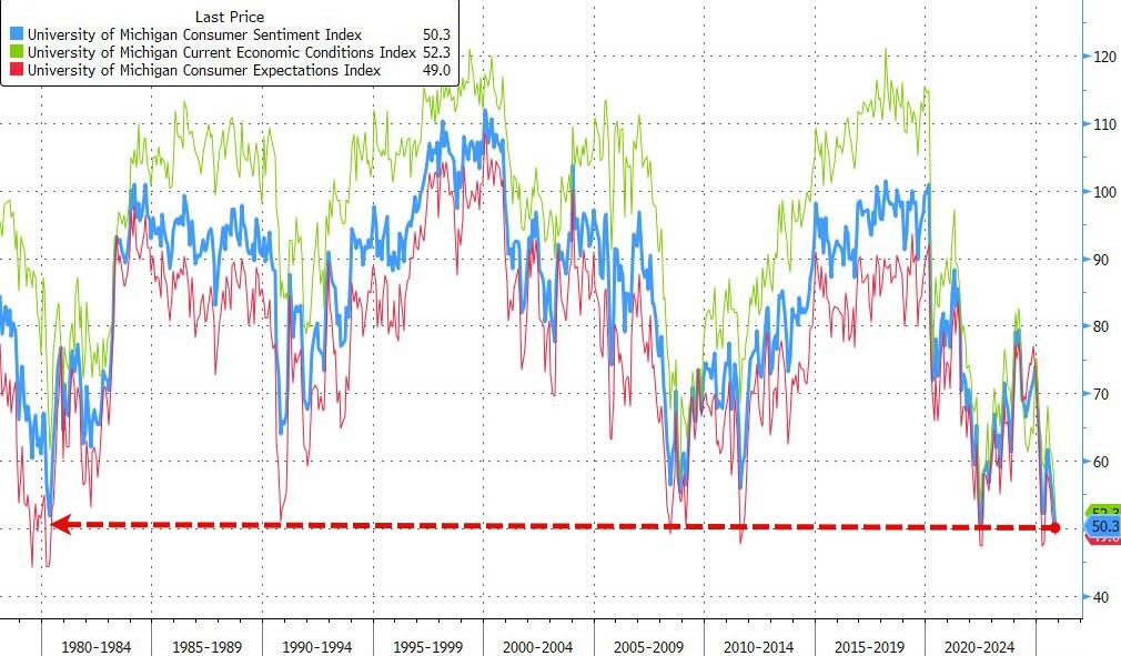 分项指数方面,反映当前经济状况的现况指数大幅下滑6.3点至52.3,创历史新低,预期59,前值58.6。消费者预期指数降至六个月低点49,预期50,前值50.3。