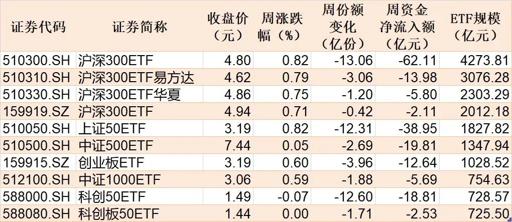 具体ETF方面,规模较大的10只宽基指数ETF本周合计净流出182.42亿元,其中沪深300ETF净流出62.11亿元,上证50ETF净流出38.95亿元。