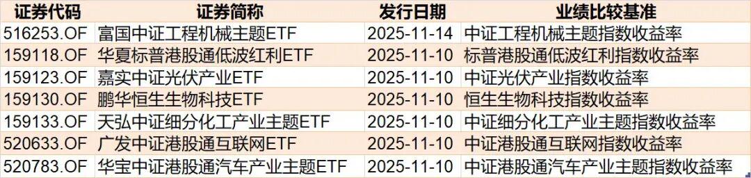 目前有7只ETF披露下周发行,跟踪标的有港股通汽车产业、港股通互联网、化工、生物科技、光伏、工程机械等。