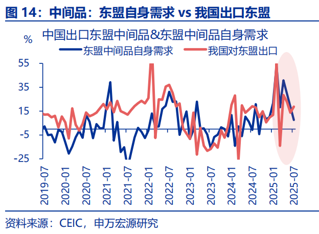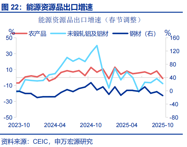 资本品出口增速分化,中间品出口增速回落。资本品方面,通用机械(-33.9pct至-9.1%)、医疗仪器及器械(-9.8pct至-1.0%)出口增速有所下降,而船舶(+25.7pct至68.4%)增速有所上升。中间品方面,汽车零配件(-16.9pct至-11.6%)、集成电路(-5.8pct至26.9%)出口增速回落。此外,能源资源出口增速大幅回落(-7.5pct至-4.0%)。其中稀土(-54.2pct至42.9%)、钢材(-11.7pct至-14.4%)、未锻轧铝及铝材(-6.2pct至-7.7%)。
