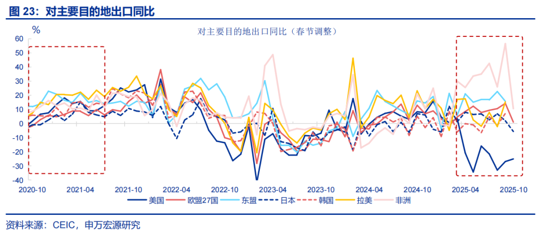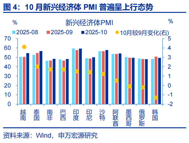 10月出口同比大幅回落,主因或并非外需走弱。10月出口同比(美元计价)较9月大幅回落9.4pct至-1.1%,虽然一定程度上受到基数走高的影响,但环比(-7.1%)仍明显弱于季节性(-3.2%);从驱动因素看,外需下滑无法完全解释本月出口下行;10月对美国出口高基数下仍在回升(+1.8pct至-25.1%),回落主要源于对新兴经济体(-11.3pct至4.5%),其中对东盟(-4.7pct至11%)、对拉美(-13.1pct至2.2%)、对非洲(-46.1pct至10.5%)出口增速明显回落,但10月越南、泰国、南非、巴西等地PMI边际分别上行4.1、2、1.7、1.7pct至54.5%、56.6%、48.3%、48.2%,且年中以来均在持续改善,新兴经济体需求也并未出现明显走弱迹象。