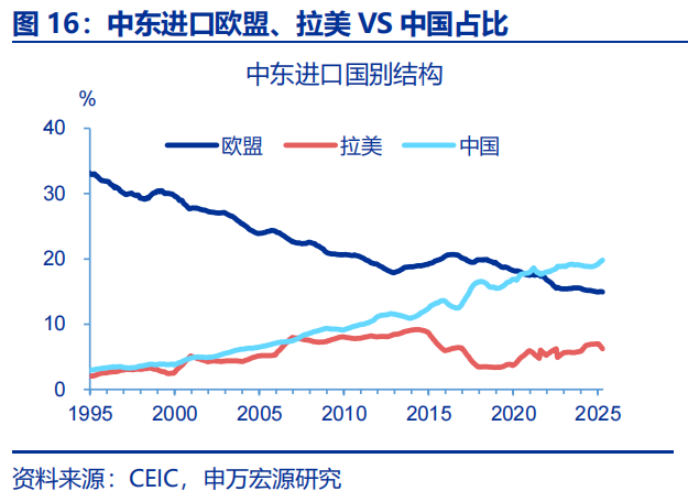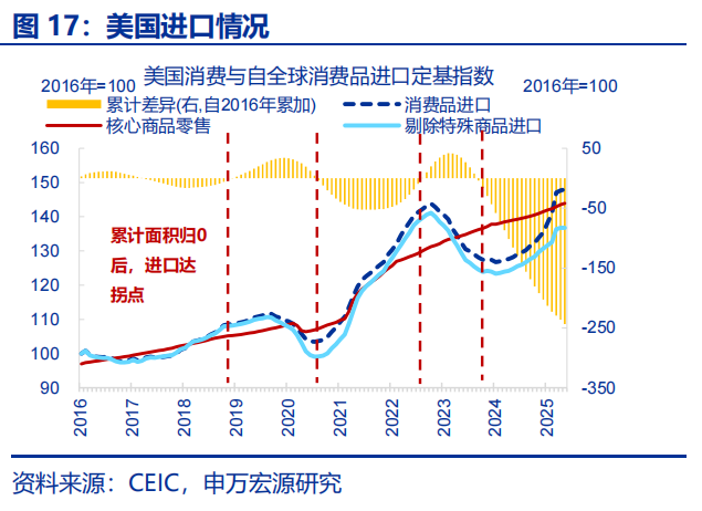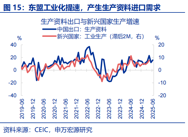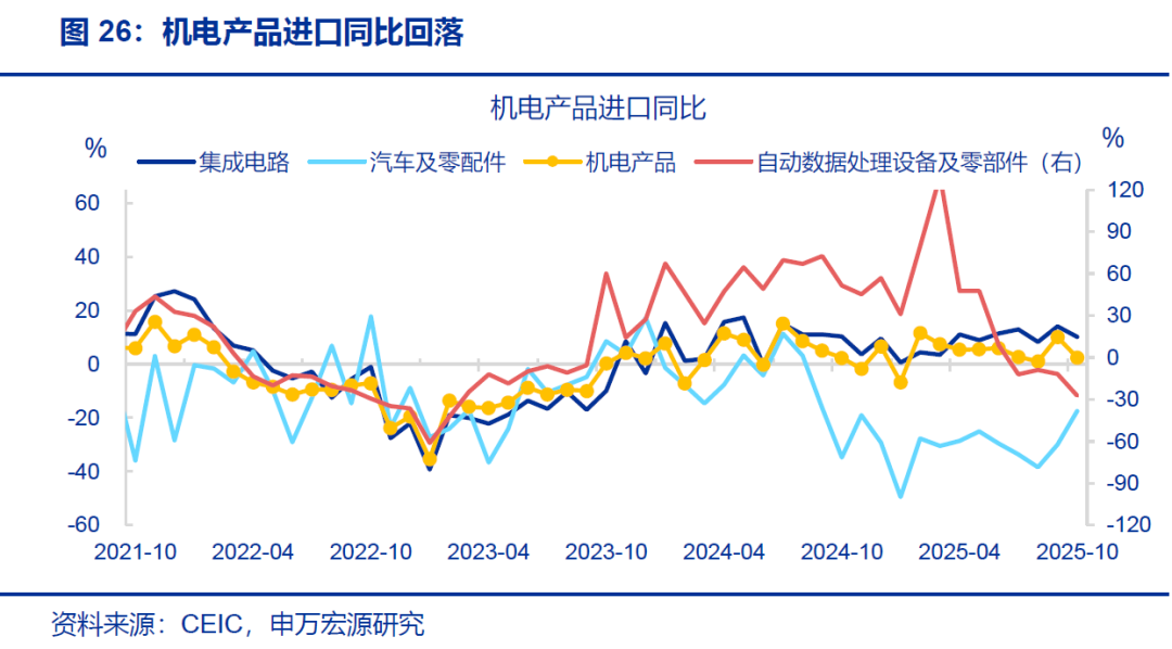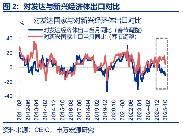 展望未来,10月底中美“关税政策”迎来缓和,加之我国在新兴份额持续提升下,预计11月出口可能会有恢复。本月对发达经济体出口出现分化,其中对欧英出口有较大回落,或与其补库空间较小有关;而对美出口仍在回升1.8pct至-25.1%,可能体现美国补库仍对进口形成拉动。同时中美关税出现进一步缓和,芬太尼关税降低10%基本对应支撑当月出口同比1个百分点左右(关税1.0时期、今年4月以来出口弹性均在1倍左右),后续对美出口可能仍有空间。与此同时,新兴国家工业化、城镇化提速带来增量的生产资料进口需求,以及我国在新兴市场份额持续提升等逻辑,我国中间品、资本品出口仍有韧性,预计11月出口可能会有恢复。