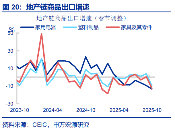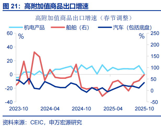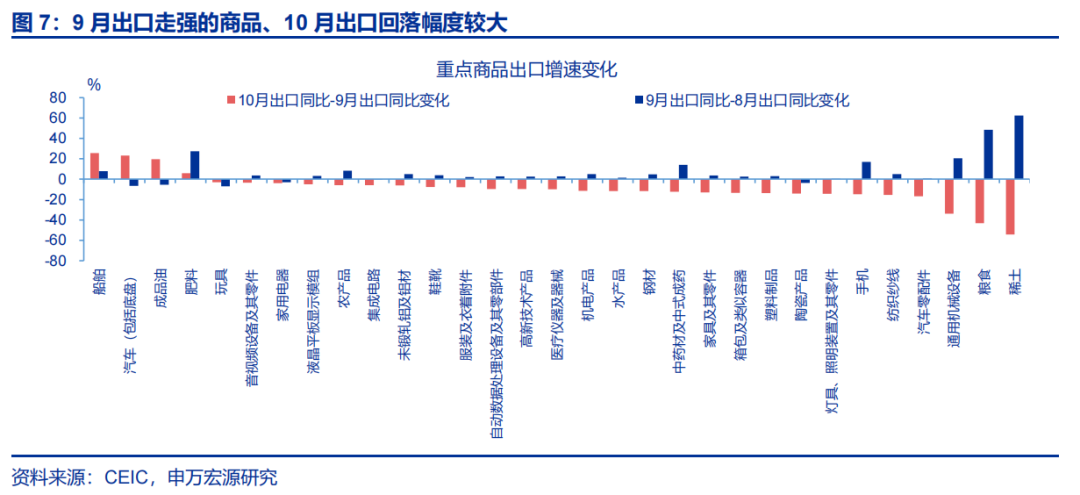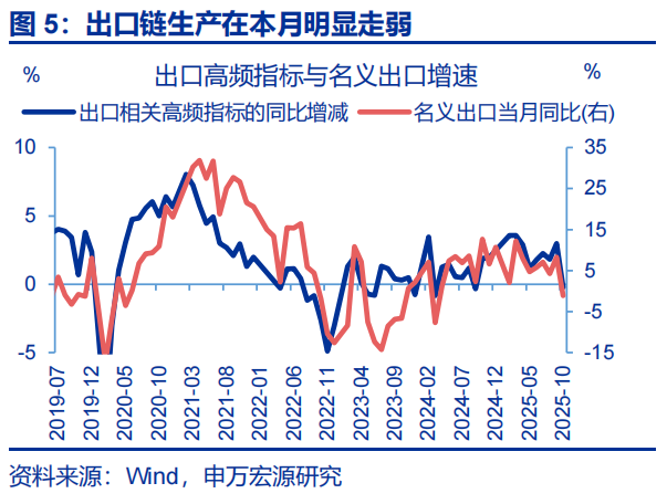 短期供给扰动才是拖累出口主因,或与前期“抢生产”结束以及工作日天数减少有关。10月工作日同比较前月减少3天,考虑到国庆节后一周休假情况也居多,进一步放大了工作日减少对供给的拖累;9月受长假的影响,制造业“抢生产”现象明显,但10月对应退坡。10月出口回落的基本上都是9月走强的商品;消费电子、轻工制品等劳动密集型行业出口跌幅也更大;高频出口链生产同比下滑至-0.2%、与10月出口增速(-1.1%)对应。