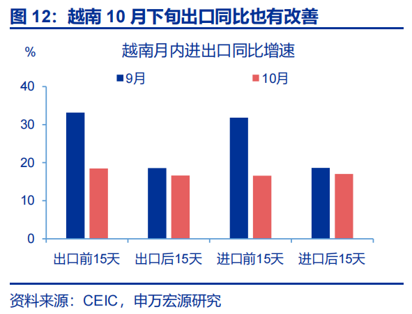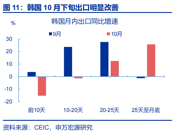 但10月下旬开始,港口外贸货运量飙升显示供给影响已在消退,受中国产业链辐射的越南韩国等出口也明显改善。考虑到“货物生产-出口报关”的时滞,9月下旬“抢生产”逐步退坡后,港口外贸货运量在10月中上旬明显回落至1.9%;伴随节后生产逐步恢复,10月最后一周港口外贸货运量明显冲高,同比上行至20%较高水平。受国内产业链辐射的韩国、越南10月出口也呈现“U型”走势,10月上中旬出口同比增速较弱,但下旬明显改善;譬如越南10月前15天出口增速为18.5%,明显低于9月同期(33.2%),但下旬(16.7%)已基本持平9月同期(18.6%);韩国10月下旬出口增速更是较上旬上行13.3pct至25.7%,亦显示供给扰动的消退。