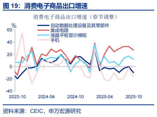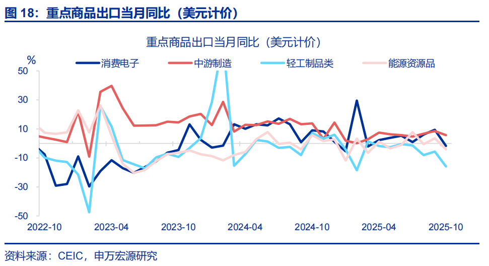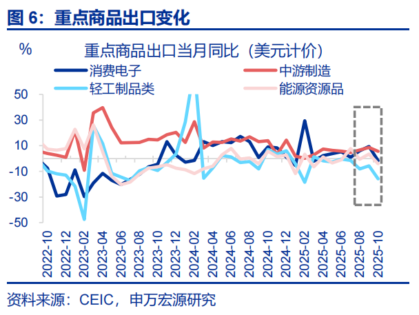 消费品方面,消费电子、轻工制品出口均有回落。根据海关公布的10月重点商品数据,消费电子出口增速大幅下降(-11.1pct至-1.7%),结构上手机(-14.7pct至-16.6%)回落幅度较大。10月轻工制品出口增速也有所回落(-10.2pct至-15.9%),其中纺织纱线(-15.5pct至-9.1%)、家具及其零件(-13.0pct至-12.7%)、鞋靴(-7.7pct至-21.0%)。