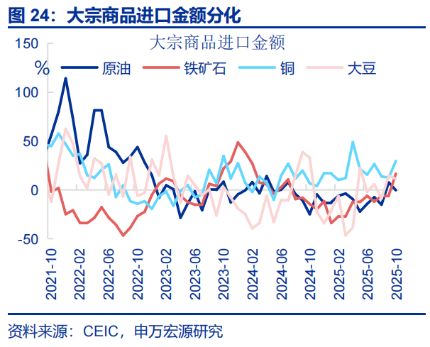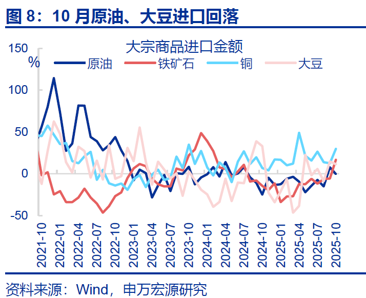 10月进口增速有所回落,机电产品与大宗商品进口均有所下降。10月进口(美元计价)同比-6.4pct至1.0%。具体来看,机电产品进口增速较上月有大幅回落(-7.6pct至2.5%),其中自动数据处理设备及其零部件(-15.3pct至-27.2%)回落幅度最大。大宗商品进口表现分化。进口数量方面,铜(-4.5pct至6.1%)、原油(-2.4pct至8.2%)、大豆(-0.1pct至17.2%)有所回落,铁矿石(+9.2pct至7.2%)有所回升。