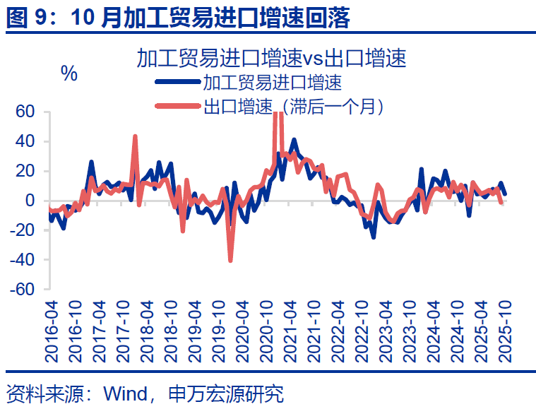 进口方面,加工贸易进口在前月走强的背景下,本月也有明显回落,或亦反映供给对本月外贸数据的扰动。10月进口(美元计价)同比回落6.4pct至1%。其中,加工贸易进口9月大幅上行6.6pct至12%,而10月回落7.3pct至4.6%,也反映供给的扰动较大。