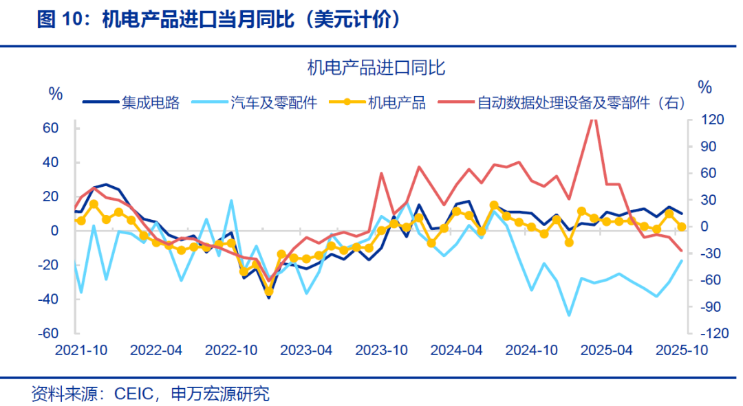 10月进口增速有所回落,机电产品与大宗商品进口均有所下降。10月进口(美元计价)同比-6.4pct至1.0%。具体来看,机电产品进口增速较上月有大幅回落(-7.6pct至2.5%),其中自动数据处理设备及其零部件(-15.3pct至-27.2%)回落幅度最大。
