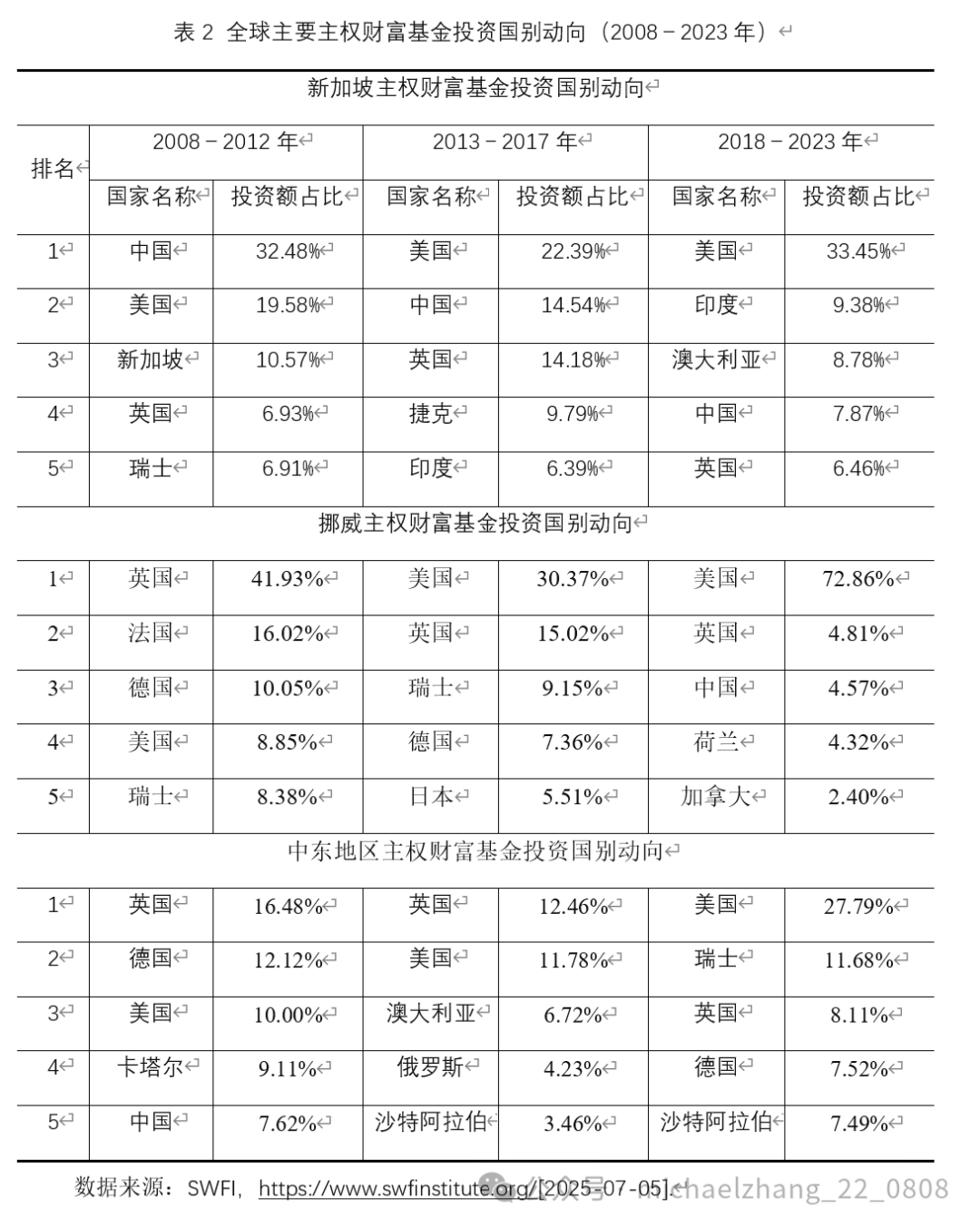 2018年中美贸易摩擦至今的逆全球化时期,全球主权财富基金的投资策略发生了明显变化,中美博弈加剧对很多国家的主权财富基金投资策略产生了重要影响,全球主要主权财富基金都加大了对美国的投资(见表2)。根据SWFI数据库数据统计,新加坡主权财富基金对亚洲的投资从2018年中美贸易摩擦前的年均52.01%下降到27.79%,而对北美的投资从年均22.16%增长为35.64%。近年来,新加坡淡马锡和GIC投资中国的比例直线下降。GIC发布最新年度报告,GIC在亚洲的投资比重降至十多年来最低,而在北美和欧洲的资产则有上升趋势。此外,淡马锡对印度的关注日益增加,淡马锡认为印度是地缘政治变化的受益者之一,其制造业吸引了大量外国直接投资。2023年印度接受全球主权基金的投资额仅次于美国,高于英国和中国等热门投资目的地。2018-2023年,挪威主权财富基金对美国的投资占比更是达到了72.86%,同时显著降低了对欧洲地区的投资,中东地区主权财富基金对美国的投资也增加到27.8%。