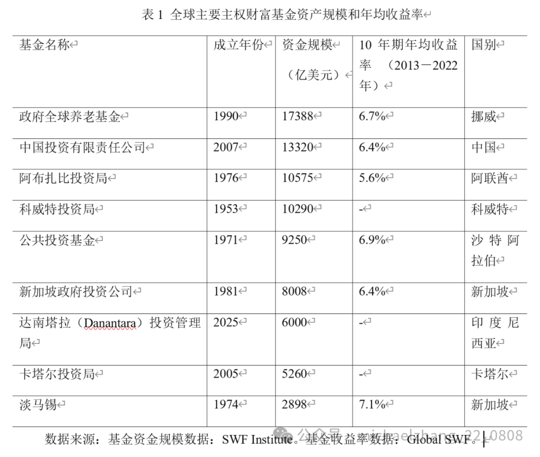 主权财富基金(Sovereign Wealth Funds,SWFs)是一国政府利用外汇储备资产或财政盈余建立的,以追求更高投资收益、提升本国经济和居民福利水平为目标的主权投资机构。主权财富基金概念的界定有广义和狭义之分:广义的概念界定涵盖了主权财富基金、货币管理当局以及传统的养老基金;狭义的概念界定则认为,主权财富基金是独立于货币当局和传统养老基金的专门的投资机构。根据资金的来源不同,基金分为资源型商品基金和非资源型商品基金;根据设立的目的不同,主权财富基金可以分为五类:一是稳定基金(Stabilization Funds),是旨在避免自然资源枯竭后导致经济出现比较大的波动,部分资源出口国为了应对“荷兰病”将资源出口收入积累下来组建基金,例如创建于1990年的挪威政府全球养老基金;二是冲销基金(Sterilization Funds),是借助设立基金对巨额外汇储备进行分流,缓解本币的升值压力,冲销本国或本地区过剩的流动性,例如创建于2007年的中国投资有限责任公司(简称中投);三是养老金储备基金(Pension Reserve Funds),是为应对老龄化社会,健全养老保险体系,跨代平滑国民财富等民生问题设立的基金,例如创建于2000年的卡塔尔投资局;四是预防基金(Preventive Funds),是为应对经济危机等类似不可预测的冲击,稳定社会的发展而设立的主权财富基金,例如创建于1953年的科威特投资局;五是战略基金(Strategy Funds),是为配合国家的发展战略,支持本国的行业改造和发展,增强本国企业的国际竞争力而设立的基金,例如创建于1974年的新加坡淡马锡控股公司。事实上,主权财富基金建立的目标往往并不唯一,部分主权财富基金的目标还会随着时间变化。如随着老龄化社会的来临,一些最初定位是应对经济危机或者配合国家发展战略的基金,其功能逐渐向跨代平滑国家财富转变。